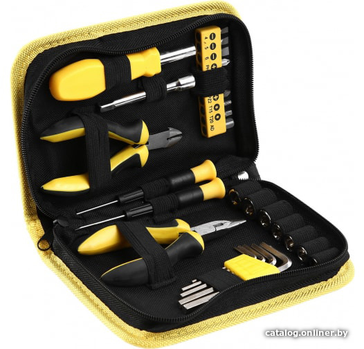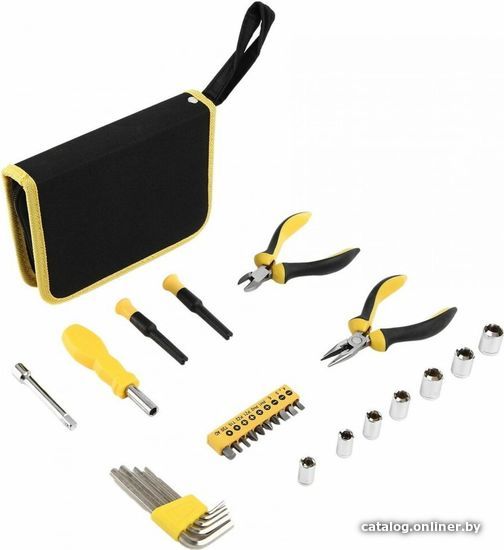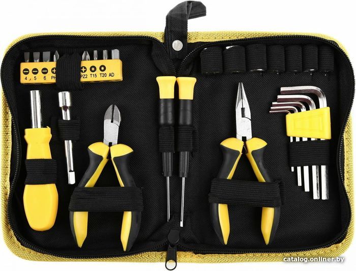 | Комплектация | - Шестигранный ключ - 5 шт.; - Отвертки - 2 шт.; - Отвёртка с набором бит (10 шт.); - Адаптер-удлинитель; - Головки - 7 шт; - Бокорезы; - Тонконосы; - Нейлоновая сумка. |