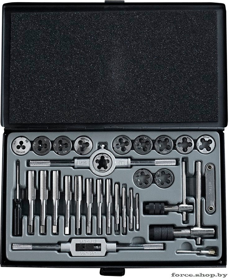 | Информация | - Используется для нарезания, калибрования внешней и внутренней резьбы. ###BR######BR###- Плашки и метчики изготовлены из инструментальной легированной стали 9ХС (средняя твердость 61 HRC), обладают повышенной износостойкостью, упругостью, сопротивлением к изгибу и кручению, стойкостью к контактным нагрузкам. ###BR######BR###- Удобный кейс – обеспечивает сохранность и мобильность набора. ###BR######BR###- Обратите внимание на качество материалов и надежность в использовании! |