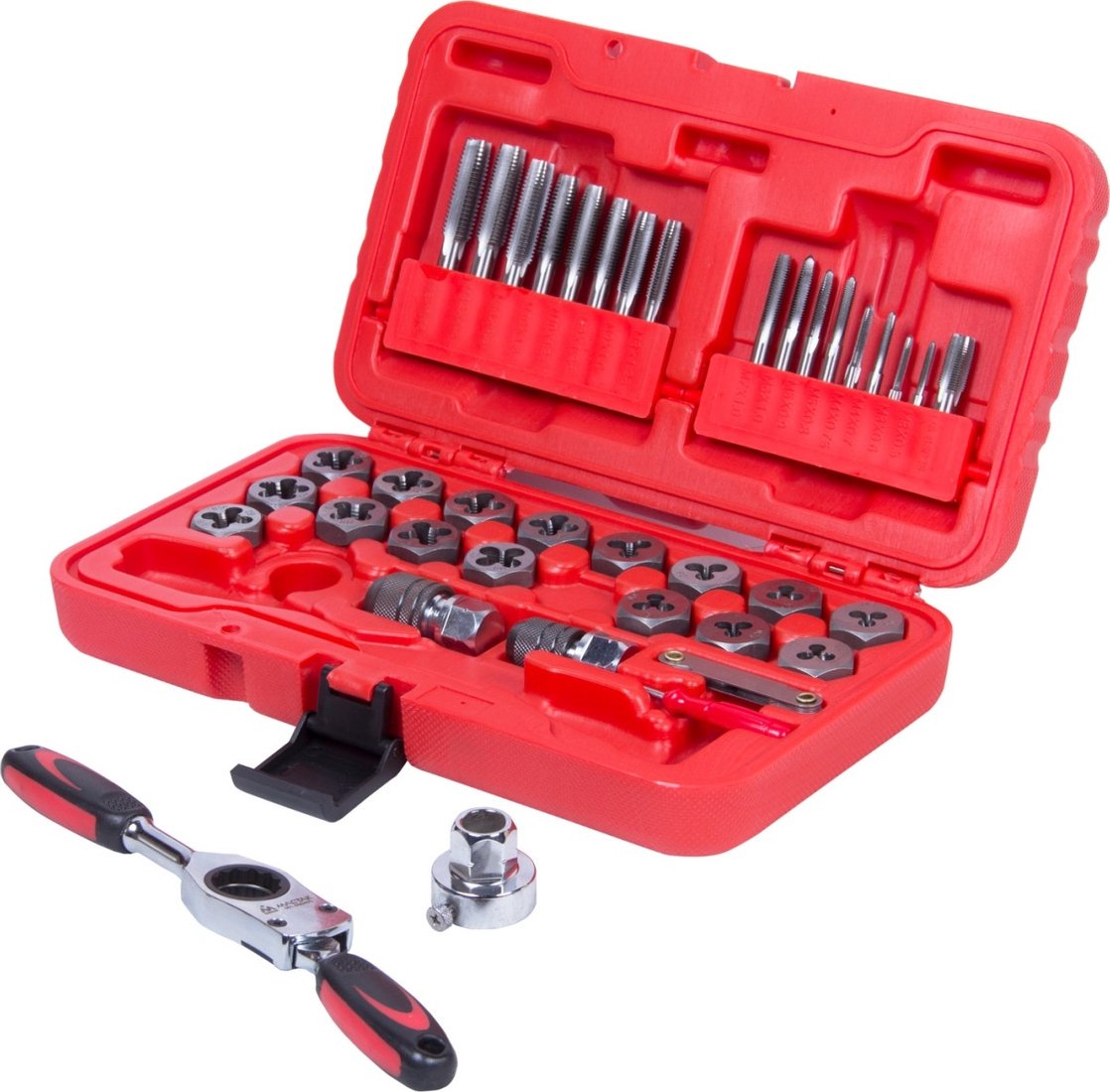 | Комплектация | Метчики и плашки - 34 шт: M3?0.5, M3?0.6, M4?0.7, M4?0.75, M5?0.8, M5?0.9, M6?1.0, M7?1.0, M8?1.25, M9?1.0, M9?1.25, M10?1.25, M10?1.5, M11?1.5, M12?1.5, M12?1.75, 1/8BSP28; Ключ трещоточный – 1 шт; Метчикодержатель M3-M6 – 1 шт; Метчикодержатель M6-M12 – 1 шт; Плашкодержатель – 1 шт; Резьбомер – 1 шт; Отвертка - 1 шт |