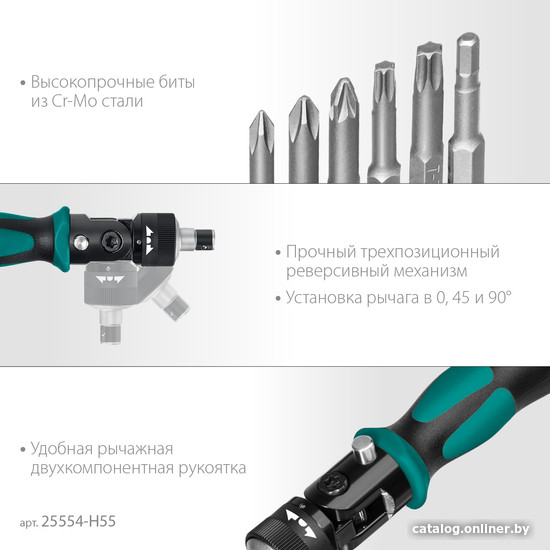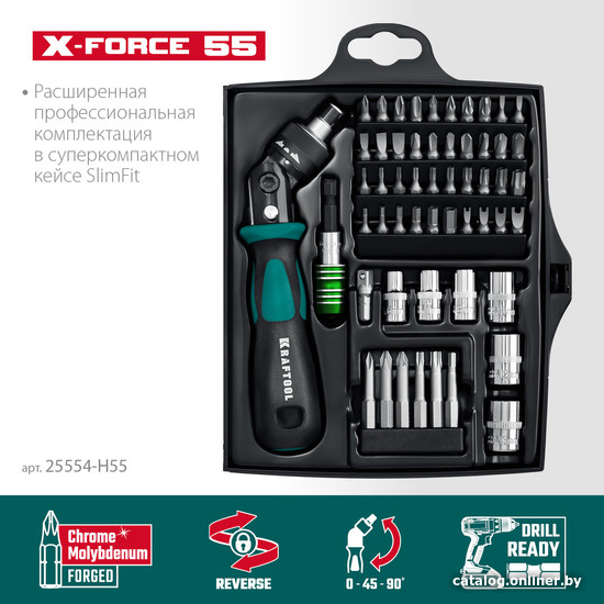 | Информация | ? Набор отвертка с битами и головками KRAFTOOL 25554-H55 (55 предметов) включает в себя высокопрочные биты из Cr-Mo стали###BR###? Присутствует прочный трехпозиционный реверсивный механизм отвертки###BR###? Удобная рычажная двухкомпонентная рукоятка для придания большого усилия при работе |