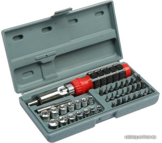 | Комплектация | Торцевые головки, 7 шт.: 6, 7, 8, 9, 10, 11, 12 мм; Торцевые головки, 7 шт.: 3/16", 1/4", 5/16", 11/32", 3/8", 7/16", 1/2"; Биты, 23 шт.: PH1-2-3, SL5-6-7, H1.5-2-2.5-3-4-5-5.5-6, T10-15-20-25-27-30-40, S1-2; Адаптер для бит 1/4" ? 1/4"; Удлинитель для бит, 60 мм; Вороток-отвертка, реверсивный, с магнитом, изменяемый угол; Кейс. |