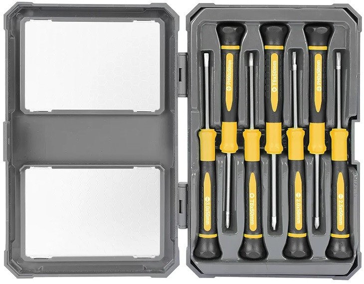 | Комплектация | SL2 x 50мм SL2,5 x 50мм SL3 x 50мм PH0 x 50мм PH00 x 50мм T6 x 50мм T8 x 50мм, Пластиковый кейс |