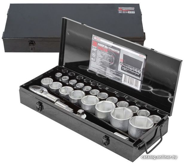 | Комплектация | Оснастка головки (17 шт.), удлинители (2 шт.), адаптер (1 шт.) Головки торцевые шестигранные (16 шт.), торцевые двенадцатигранные (1 шт.: 36 мм) Торцевые шестигранные головки 1? (55, 60, 65 мм), 3/4? (17, 19, 21, 22, 24, 27, 30, 32, 36, 38, 41, 46, 50 мм) Удлинители 3/4? (200, 490 мм) Ключи вороток (1 шт.) Воротки T-образный (490 мм), Г-образный (200 мм) |
