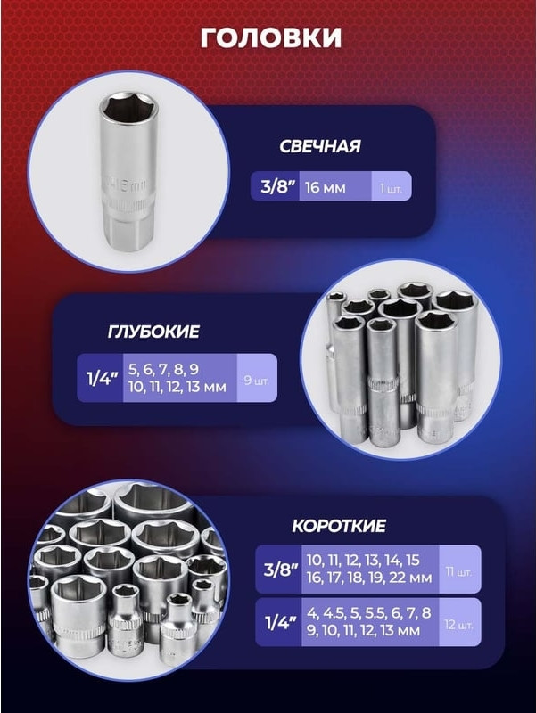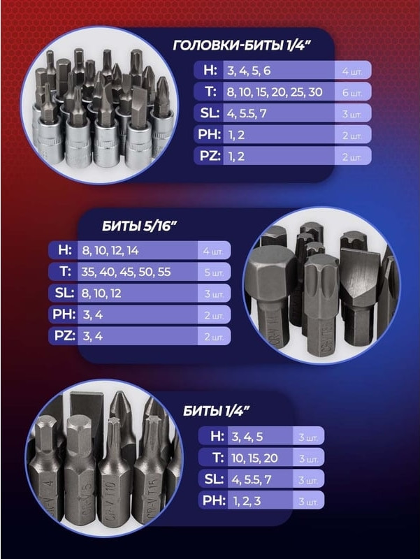 | Комплектация | Посадочный квадрат1/4": Головки: 4, 4.5, 5, 5.5, 6, 7, 8, 9, 10, 11, 12, 13 мм Головки глубокие: 5, 6, 7,8, 9, 10, 11, 12,13 мм Битодержатель: 1/4(F)?1/4(M) Головки биты: H: 3,4,5, 6; T: 8, 10, 15, 20, 25, 30; SL:4, 5.5, 7 PH: 1, 2 PZ:1,2 Биты: H 3, 4, 5; T: 10, 15, 20; SL: 4, 5.5,7; PH:1, 2, 3. Адаптер под шуруповерт Рукоятка для головок Трещотка реверсивная Вороток Т-образный Гибкий удлинитель Кардан шарнирный Удлинители: L-50, L-100 мм Посадочный квадрат 3/8": Биты 5/16": H: 8, 10, 12, 14: T: 35, 40, 45, 50, 55; SL: 8, 10, 12; PH: 3, 4; PZ:3, 4. Головки: 10, 11, 12, 13, 14, 15, 16, 17, 18, 19, 22 мм Головка свечная 16 мм Трещотка реверсивная Кардан шарнирный Удлинитель L-125 мм Битодержатель: 3/8(F)+5/16(M) Ключи Г-образные шестигранные: 1.5, 2, 2.5 мм Кейс |