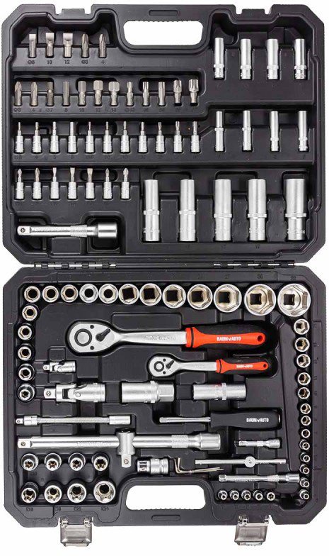 | Комплектация | трещотка (2 шт.), ключ гаечный (4 шт.), рукоятка (1 шт.), кейс, головки (76 шт.), насадки-биты (17 шт.), удлинители (5 шт.), кардан (2 шт.), держатель (1 шт.), адаптер (1 шт.) |