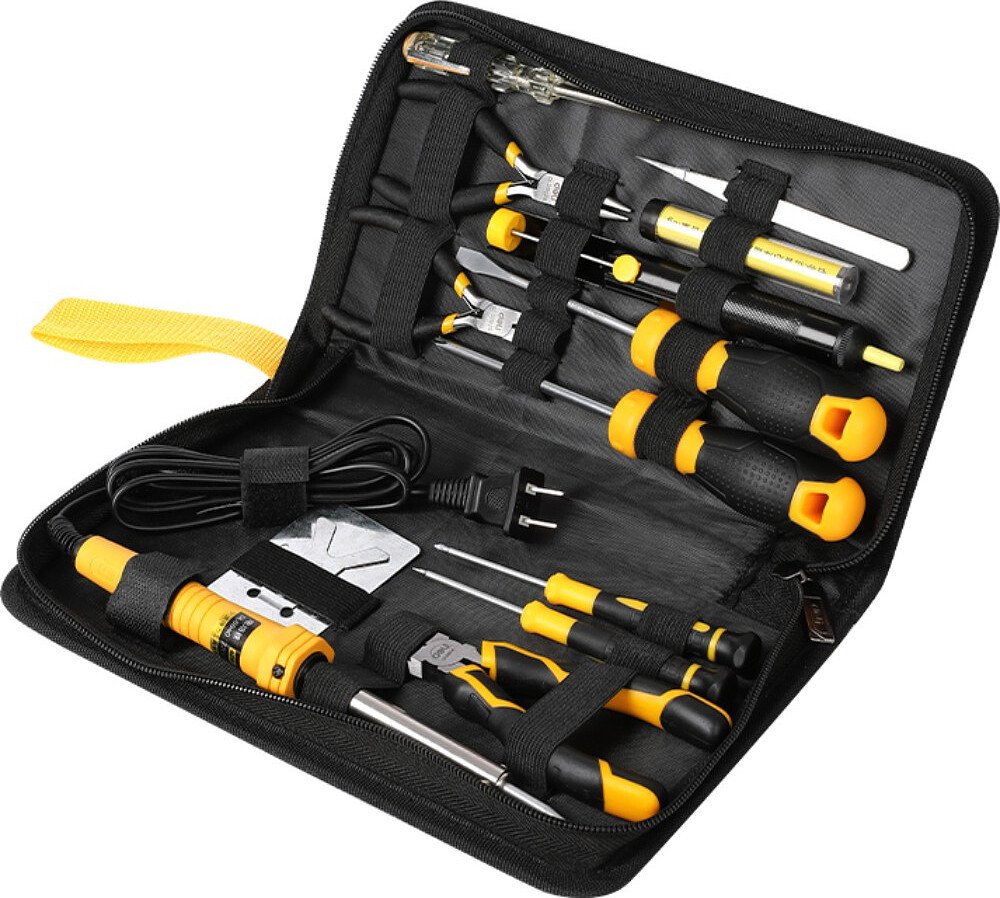 | Комплектация | 5-дюймовые мини-плоскогубцы с длинным носом 5-дюймовые мини-диагональные плоскогубцы Шлицевая отвертка Прецизионная крестовая отвертка Шлицевая отвертка SL6x100 мм Крестовая отвертка PH2 x 100 мм Ножницы электрика Электрический паяльник Подставка для паяльника Припой Вакуумный оловянный насос Заостренный пинцет Индикаторная отвертка |