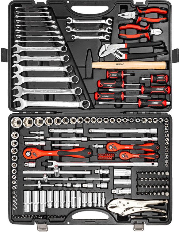 | Информация | - Посадочный квадрат: 1/4", 3/8", 1/2". В этом наборе представлены головки с 6-гранным и Е-профилем, короткие и глубокие, что делает его универсальным инструментом для ремонта автомобилей. - В комплекте вы найдете разнообразные головки, бит и ключи, что позволяет использовать его для ремонта множества моделей машин. Трещотка обеспечивает быстрое и легкое изменение направления вращения, что значительно упрощает работу. - Дорожный чемодан, входящий в набор, удобно помещается в багажник вашего автомобиля, что делает его идеальным для поездок. Этот набор инструментов также отлично подходит для домашнего использования — будь то мелкий ремонт или крупное строительство, он поможет вам быстро и эффективно завершить любую задачу. - Инструменты изготовлены из высококачественных материалов, что гарантирует их долговечность и надежность. Комплектация включает 61 головку, 62 биты, 3 трещотки, 3 Т-образных воротка, 8 удлинителей, гибкий удлинитель, 3 карданных шарнира, 2 свечные головки, шарнирный вороток, 3 адаптера, 3 битодержателя, 3 разрезных ключа, 14 комбинированных ключей, 3 крестовые и 3 шлицевые отвертки, магнитный телескопический инструмент, плоскогубцы, пассатижи, бокорезы, грейферный захват, молоток и кейс. - Набор поставляется в качественном пластиковом кейсе с надежными металлическими замками и петлями, что обеспечивает его безопасность и удобство хранения. |