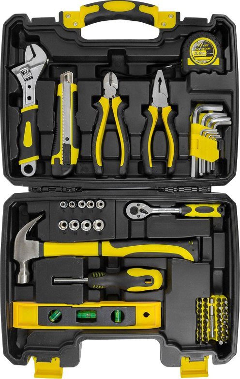 | Комплектация | кусачки (1 шт.), пассатижи (1 шт.), молоток (1 шт.), нож (1 шт.), трещотка (1/4"), отвертка под биты (1 шт., 1/4"), рулетка (1 шт.), кейс |
