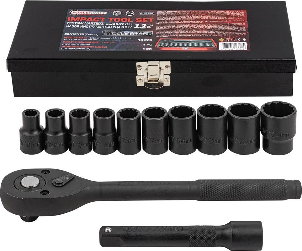 | Комплектация | головки торцевые 12-гранные (10, 12, 13, 14, 15, 17, 19, 21, 22, 24 мм); усиленная трещотка (1 шт.); удлинитель ударный (1 шт.); прочный металлический кейс (1 шт.) |