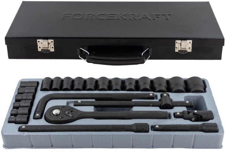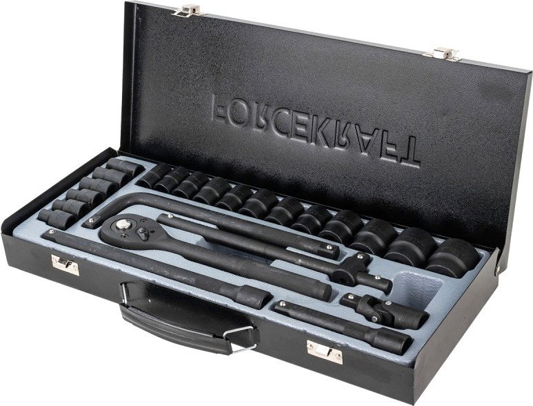 | Комплектация | торцевые 6-гранные ударные головки (размеры: 8, 9, 10, 12, 13, 14, 15, 16, 17, 18, 19, 20, 21, 22, 24, 27, 30, 32 мм); трещотка 24 зуба; удлинители длиной 125 и 250 мм; вороток длиной 250 мм; кардан; вороток Т-образный; прочный и компактный кейс для хранения и переноски. |