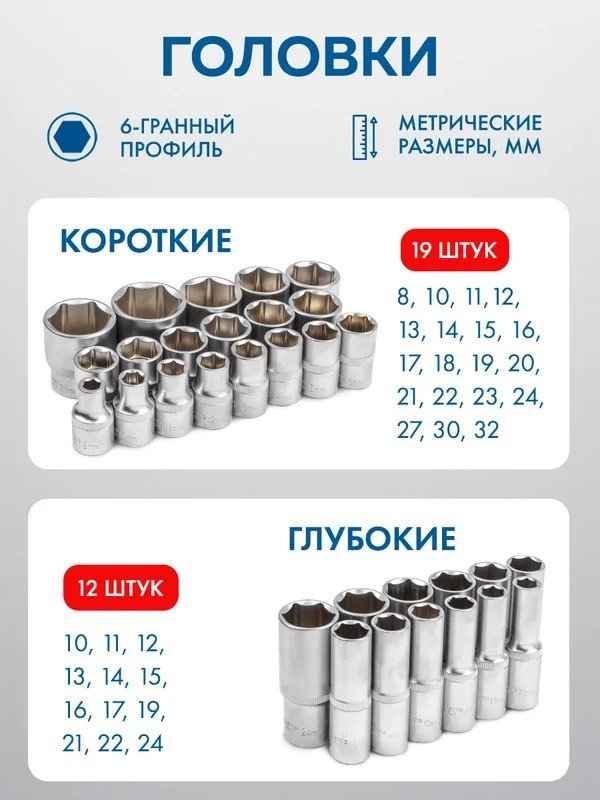 | Комплектация | 19 торцевых головок (8–32 мм), 12 глубоких головок (10–24 мм), Г-образный вороток 300 мм, удлинители (125 и 250 мм), карданный шарнир, металлический кейс |