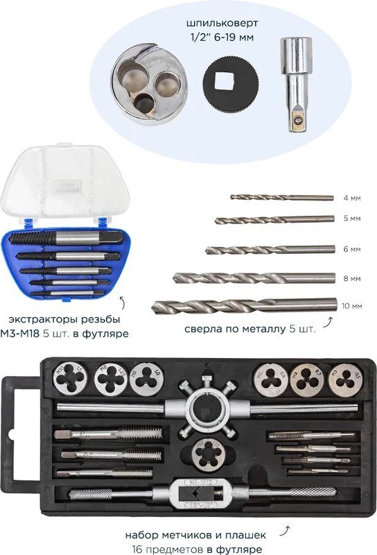 | Комплектация | шпильковерт 1/2" на 6–19 мм., экстракторы резьбы М3–М18 (5 шт в футляре), сверла по металлу (4, 5, 6, 8, 10 мм), набор метчиков и плашек (16 шт. в футляре), 4 разнопрофильных напильников 200 мм с эргономичными двухкомпонентные рукоятками, кернер (керн) 120 мм, выколотки 150 мм (3, 4, 5 мм), зубила 150 мм (14, 16, 20 мм), штангенциркуль 230 мм, щетка по металлу 260 мм с эргономичной и профилированной рукояткой, молоток 600 грамм 335 мм, ложемент. |