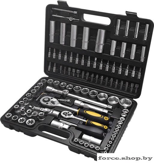| Комплектация | Торцевая головка квадрат 1/4" (4, 4.5, 5, 5.5, 6, 7, 8, 9, 10, 11, 12, 13, 14мм) TORX E4, Е5, Е6, Е7, Е8) - 18шт. Торцевая головка глубокая квадрат 1/4" (6, 7, 8, 9, 10, 11, 12, 13 мм) - 8 шт. Торцевая головка квадрат 1/2" (10, 11, 12, 13, 14, 15, 16,17, 18, 19, 20, 21, 22, 24, 27, 30, 32 мм, TORX Е10, Е11, Е12, Е14, Е16, Е18, Е20, Е24) - 25шт. Торцевая головка глубокая квадрат 1/2" (14, 15, 17, 19,22 мм) - 5шт. Голока квадрат 1/4" со вставками (SL4, SL5.5, SL6.5, PH1, PH2, PZ2, HEX3, HEX4, HEX5, HEX6, T8, Т10, Т15, Т20, Т25, Т27, Т30) - 8 шт. Свечная головка квадрат 1/2" 16мм - 1шт. Свечная головка квадрат 1/2" 21мм - 1 шт. Удлинитель 2" квадрат 1/4" - 1 шт. Удлинитель 4" квадрат 1/4" - 1шт. Удлинитель 5" квадрат 1/2" - 1 шт. Удлинитель 10" квадрат 1/2" - 1 шт. Переходник для удлинителя 250мм квадрат 1/2" - 1шт. Карданный шарнир для торцевой головки квадрат 1/4" - 1 шт. Карданный шарнир для торцевой головки квадрат 1/2" - 1 шт. Рукоятка с трещеткой квадрат 1/4" с быстрым сбросом - 1 шт. Рукоятка с трещеткой квадрат 1/2" с быстрым сбросом - 1 шт. Рукоятка для торцевых головок квадрат 1/4" - 1 шт. Т-образный вороток квадрат 1/4" - 1 шт. Бита 30мм (SL8, SL10, SL12, Т40, Т45, Т50, Т55, Т60, РН3, РН4, РZ4, HEX7, HEX8, HEX10, HEX12, HEX14) 17шт.Шестигранный ключ - 3шт. |