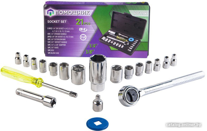 | Информация | ? Универсальный набор инструментов Помощник P019K содержит 21 предмет. ? В наборе имеются инструменты с размерами 1/4" и 3/8" (6гр) от 4 до 17 мм. ?? Включает в себя все необходимые инструменты для широкого спектра работ. |