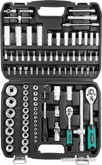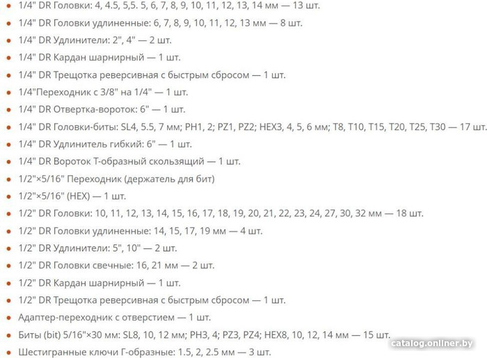 | Комплектация | 1/4" DR Головки: 4, 4.5, 5,5. 5, 6, 7, 8, 9, 10, 11, 12, 13, 14 мм — 13 шт. 1/4" DR Головки удлиненные: 6, 7, 8, 9, 10, 11, 12, 13 мм — 8 шт. 1/4" DR Удлинители: 2", 4" — 2 шт. 1/4" DR Кардан шарнирный — 1 шт. 1/4" DR Трещотка реверсивная с быстрым сбросом — 1 шт. 1/4"Переходник с 3/8" на 1/4" — 1 шт. 1/4" DR Отвертка-вороток: 6" — 1 шт. 1/4" DR Головки-биты: SL4, 5.5, 7 мм; PH1, 2; PZ1, PZ2; HEX3, 4, 5, 6 мм; T8, T10, T15, T20, T25, T30 — 17 шт. 1/4" DR Удлинитель гибкий: 6" — 1 шт. 1/4" DR Вороток Т-образный скользящий — 1 шт. 1/2"?5/16" Переходник (держатель для бит) 1/2"?5/16" (HEX) — 1 шт. 1/2" DR Головки: 10, 11, 12, 13, 14, 15, 16, 17, 18, 19, 20, 21, 22, 23, 24, 27, 30, 32 мм — 18 шт. 1/2" DR Головки удлиненные: 14, 15, 17, 19 мм — 4 шт. 1/2" DR Удлинители: 5", 10" — 2 шт. 1/2" DR Головки свечные: 16, 21 мм — 2 шт. 1/2" DR Кардан шарнирный — 1 шт. 1/2" DR Трещотка реверсивная с быстрым сбросом — 1 шт. Адаптер-переходник с отверстием — 1 шт. Биты (bit) 5/16"?30 мм: SL8, 10, 12 мм; PH3, 4; PZ3, PZ4; HEX8, 10, 12, 14 мм — 15 шт. Шестигранные ключи Г-образные: 1.5, 2, 2.5 мм — 3 шт. |