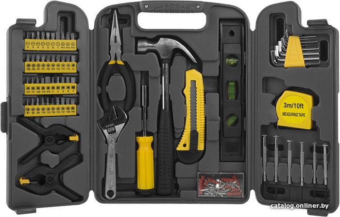 | Комплектация | Тонкогубцы 150 мм; Разводной ключ 150 мм; Молоток 225 г; Уровень 230 мм; Струбцины 100 мм; Держатель для бит; Рулетка 3 м; Нож; Шестигранные ключи 8 шт; Отвёртки для точной механики 6 шт; Биты 40 шт; Набор аксессуаров 80 шт. |