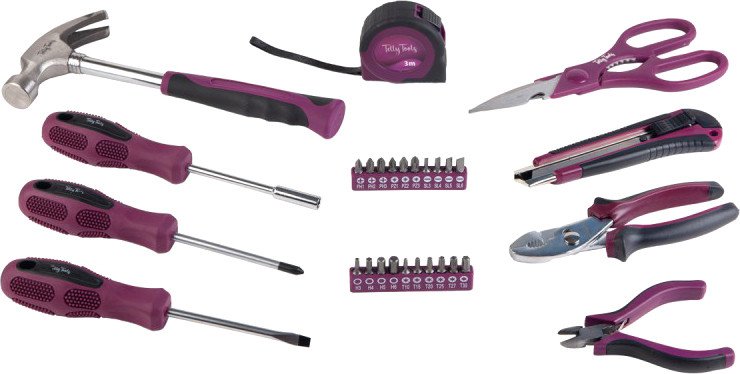 | Комплектация | биты 1/4" 20 шт., рукоятка-битодержатель 205 мм, рулетка 3м?16мм, нож канцелярский 160 мм, плоскогубцы 160 мм, молоток гвоздодер 240 мм, отвертки (SL5.5?100, PH2?100), кусачки 110 мм, ножницы 210 мм, сумка |