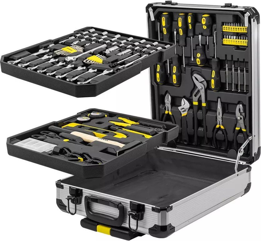 | Комплектация | трещотки 2 шт., головки 27 шт., воротки 2 шт., карданы 2 шт., головки свеч. 2 шт., удлинитель 3 шт., удлинитель гибкий, рукоятка, ключи комбинированные 9 шт., бокорезы, ключ разводной, пассатижи 3 шт., отвертки 13 шт., отвертка индикаторная, отвертки для точных работ 6 шт., манометр для шин, биты 24 шт., ключи Г-обр. 8 шт., битодержатель, нож, рулетка, шурупы, гвозди, уровень строительный, молоток-гвоздодер, изолента, зажимы универсальные, клещи, клеевой пистолет, зажим гейферный, передвижной металлический чемодан с металлическими защелками со встроенным замком под ключ. |