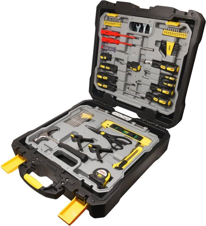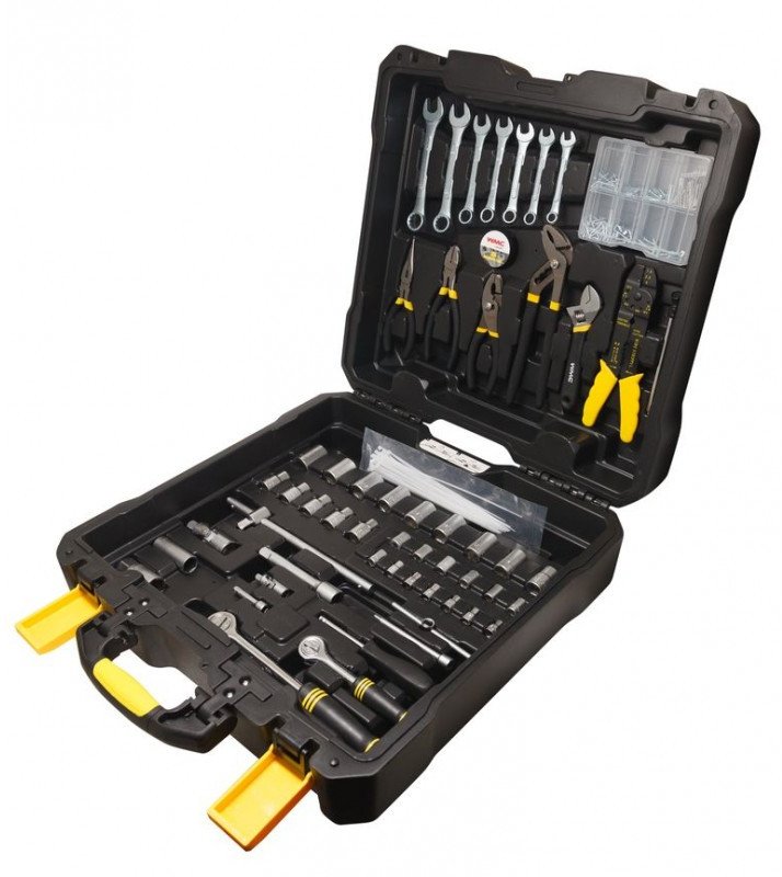 | Комплектация | прецизионные отвертки, ключи шестигранные, биты для отвертки, адаптер, отвертка с храповым механизмом, держатель магнитный, отвертки, отвертки с изоляционным кожухом, индикаторная отвертка, бокорезы, ключ разводной, пассатижи, изолента, клещи для зачистки проводов, ключи комбинированные, механический тестер давления шин, молоток-гвоздодер, рулетка, нож канцелярский, уровень строительный, ножницы канцелярские, зажимы универсальные, трещотки, головки, воротки Т-образные, карданы, головки свечные, удлинители, рукоятка для головок, комплект метизов, комплект хомутов, передвижной чемодан. |