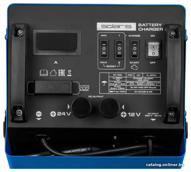 | Информация | Пуско-зарядное устройство ST-402 предназначено для заряда свинцово-кислотных 12 В и 24 В аккумуляторных батарей (АКБ) автомобилей, грузовиков, микроавтобусов, тракторов, сельхозмашин емкостью от 20 до 800 А*ч. Возможна зарядка нескольких аккумуляторов при параллельном подключении с разной емкостью, которая должна суммарно соответствовать величине не более 800 А*ч. Также устройство может использоваться для помощи при старте бензиновых и дизельных двигателей объемом до 2000-2500 см3 (в зависимости от степени разряженности аккумулятора, состояния двигателя и температуры окружающей среды). Внимание! Устройство не заменяет аккумулятор и не восстанавливает работоспособность неисправного аккумулятора. Запуск автомобиля без установленного аккумулятора либо с неисправным аккумулятором может вывести из строя устройство или бортовую электронику автомобиля. |