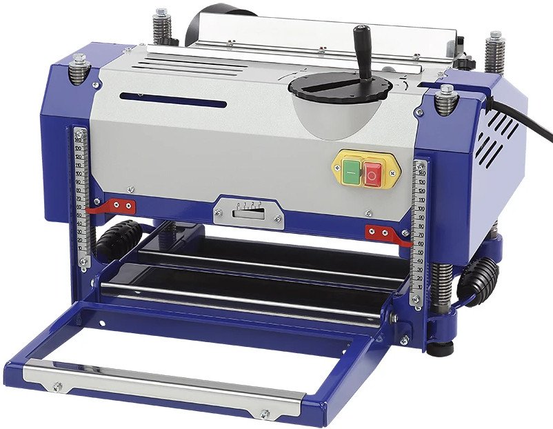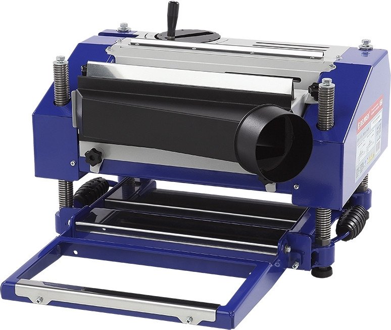 | Информация | - Рейсмусовый станок BELMASH PB-2000/330 предназначен для калибровки заготовки по толщине. В результате обработки получаются ровные заготовки, которые могут применяться в столярном деле, в строительстве, при изготовлении мебели и т.п.###BR######BR###- Станок сочетает в себе надежность, точность, мобильность и сравнительно невысокую цену.###BR######BR###- **Особенности:**###BR######BR###- Четыре опорные винтовые стойки для максимально точной настройки положения строгального вала над столом.###BR######BR###- Увеличенная глубина строгания, при номинальной и максимальной ширине съёма.###BR######BR###- Маховик точной настройки глубины рейсмусования до 0,1 мм.###BR######BR###- Мощный асинхронный двигатель 2000 Вт.###BR######BR###- Строгальный вал имеет три ножа с двусторонней заточкой.###BR######BR###- Токовый прерыватель и магнитный пускатель.###BR######BR###- Компактный, с ручками для переноски.###BR######BR###- Зубчатый подающий вал для надежной подачи заготовки.###BR######BR###- Дополнительный подающий вал из полиуретана для чистовой обработки.###BR######BR###- **Конструкция:**###BR######BR###- Особенность модели BELMASH PB-2000/330 – режущий блок расположен на четырёх винтовых колоннах из нержавеющей стали. Они обеспечивают возможность максимально точной настройки положения строгального вала над столом.###BR######BR###- Подъем и опускание режущего блока происходит синхронно и с равномерно-распределенной нагрузкой. Это обеспечивает жесткость конструкции, поглощает рабочие вибрации, увеличивает качество обработки материала.###BR######BR###- Специальный маховик позволяет максимально точно выставлять высоту обработки, вплоть до 0,1 мм. Ход режущего блока при полном обороте маховика составляет 2,5 мм. Контроль осуществляется по шкалам высоты рейсмусования и припуска.###BR######BR###- Станок оснащен двигателем мощностью 2 кВт, выдающим частоту вращения режущего вала 8600 об/мин. Также, он имеет встроенное устройство отключения от источника питания при перегреве двигателя и магнитный пускатель, предотвращающий включение станка после восстановления исчезнувшего напряжения.###BR######BR###- Вращение от двигателя к ножевому валу передается с помощью ременной передачи. Стальной трехножевой вал обеспечивает высокое качество обработки. Защитные ограждения и кожухи предотвращают доступ к вращающимся частям станка.###BR######BR###- Максимальная глубина рейсмусования за один проход при ширине заготовки 200 мм - 3 мм, при ширине заготовки от 200 до 330 мм - 1,5 мм.###BR######BR###- Автоматическая подача заготовки в зону резания осуществляется со скоростью 6 м/мин. Подающий вал имеет зубчатую поверхность, это обеспечивает надежную подачу заготовки в зону резания, исключает проскальзывания и обратную отдачу.###BR######BR###- Дополнительно в комплект станка входит подающий вал с наружной поверхностью из полиуретана, который устанавливается взамен зубчатого вала при выполнении чистового рейсмусования.###BR######BR###- На станке имеются два складных стола, которые предназначены для увеличения общей рабочей поверхности и поддержания выступающих концов обрабатываемой заготовки.###BR######BR###- При обработке заготовок длиной более 2 м рекомендуем использовать подставки BELMASH RS-01 и BELMASH RS-02.###BR######BR###- Для удобства обратной подачи заготовки в верхней части станка предусмотрены ребра.###BR######BR###- Станок оснащен патрубком для подключения системы аспирации. Он может устанавливаться как в правую, так и в левую ст