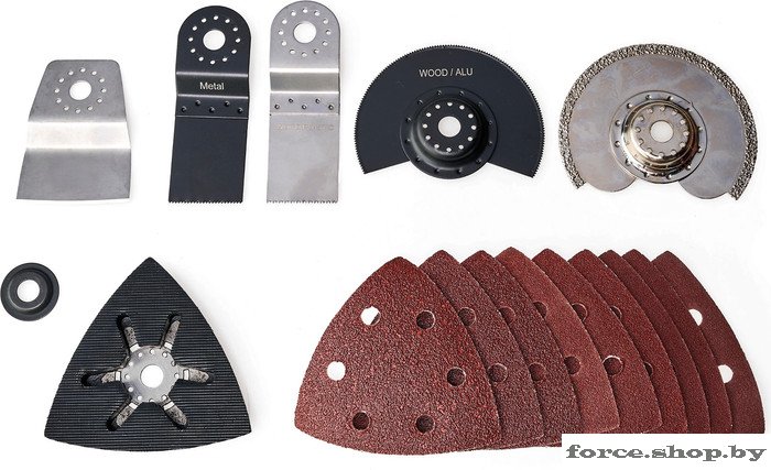 | Комплект поставки | - 1 дельта-шлифовальный башмак с застежкой-липучкой###BR###- 1 пильное полотно с алмазным сегментом для затирки плитки###BR###- 1 сегментное пильное полотно (HSS) для дерева, пластика, мягкого металла###BR###- 1 погружное пильное полотно (BIM) по металлу###BR###- 1 погружное пильное полотно (HCS) для дерева и пластика###BR###- 9 наждачных бумаг (3*P60/3*P80/3*P120)###BR###- 1x скребок###BR######BR###В комплект поставки не входят аккумулятор и зарядное устройство (продаются отдельно). |