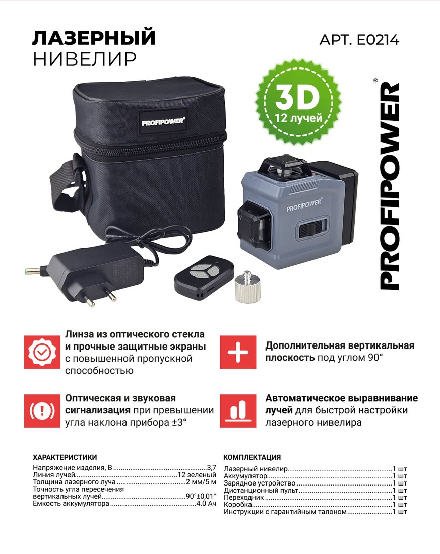 | Информация | ??Текст описания составлен при помощи искусственного интеллекта. - Лазерный нивелир Profipower NL-12G обеспечивает точность до 4 мм на 10 м, что делает его идеальным инструментом для строительных и отделочных работ. - С помощью этого нивелира можно строить прямые линии, крестовые линии и круговые линии, что позволяет выполнять различные задачи с высокой точностью. - Дальность работы с приёмником составляет до 30 м, что обеспечивает широкий охват рабочей зоны. - Класс защиты корпуса IP54 гарантирует надежную защиту от пыли и брызг воды, что делает нивелир надежным в различных условиях. - Резьба под штатив 5/8" обеспечивает удобство использования на различных поверхностях и позволяет надежно закрепить нивелир для точной работы. - Дистанционное управление при помощи пульта позволяет управлять нивелиром из удобного для вас места, что упрощает работу. - Тип призменный обеспечивает четкое и яркое отображение лазерных линий для удобной работы в различных условиях освещения. - Все эти характеристики делают Лазерный нивелир Profipower NL-12G незаменимым инструментом для профессиональных строителей и ремонтников. |