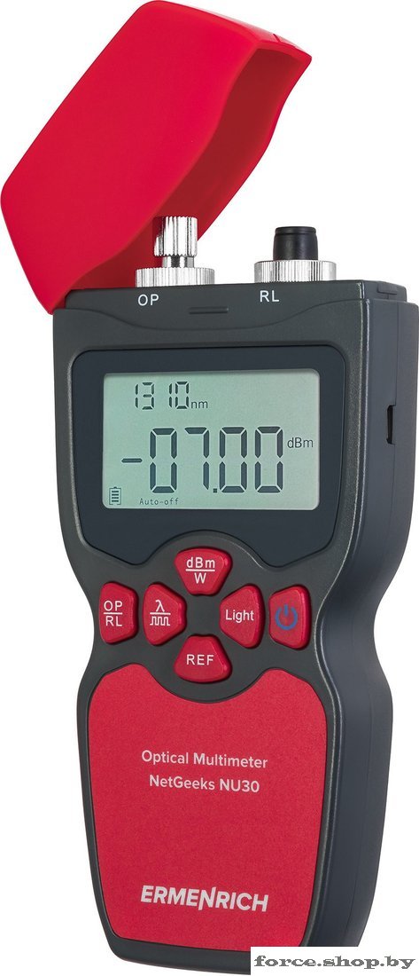 | Информация | - Мультиметр предназначен для измерения оптической мощности и вносимых потерь в оптоволоконных линиях, а также для визуального определения обрывов и неисправностей сетевого кабеля с помощью функции VFL. Пользователь может выбрать одну из 6 длин волн: 850, 1300, 1310, 1490, 1550 или 1625 нм. Функция VFL работает на длине волны 650 нм и может использоваться как отдельно, так и одновременно с измерением мощности. Доступны два режима работы для VFL: непрерывный и импульсный.###BR######BR###- Для подключения измерителя к сети предусмотрены интерфейсы FC, SC и ST. Мощность измеряется в дБ, дБм или Вт, а для выбора единицы измерения имеется отдельная кнопка. Рекомендуется устанавливать опорный уровень для более точного определения вносимых потерь, в этом случае разница между входной и выходной мощностью будет вычисляться автоматически. Все данные отображаются на монохромном ЖК-дисплее с подсветкой. Для питания устройства используются три батарейки типа AAA (в комплект не входят).###BR######BR###- Основные особенности:###BR###• Измерение мощности и вносимых потерь###BR###• Визуальное тестирование сетевого кабеля (функция VFL)###BR###• Выбор одной из 6 длин волн###BR###• Выбор единиц измерения мощности: дБ, дБм или Вт###BR###• Кнопка установки опорного уровня для быстрого определения потерь###BR###• Разъемы подключения трех типов: FC, SC и ST###BR###• Автоотключение при бездействии в течение 30 минут###BR######BR###- В комплект входят:###BR###• Передатчик###BR###• Чехол###BR###• Ватные палочки###BR###• Инструкция по эксплуатации и гарантийный талон |