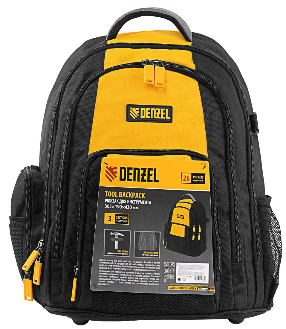 | Информация | - Рюкзак Denzel 90296 размером 365 х 190 х 430 мм, с 3 отделениями и 26 карманами (в том числе сетчатыми), предназначен для размещения и транспортировки ручного инструмента. 3 секции позволяют организовать упорядоченное хранение всех необходимых предметов. Рюкзак пригодится выездному мастеру. - Преимущества Износостойкость — рюкзак изготовлен из прочного синтетического материала, устойчивого к разрыву и истиранию. Дополнительные возможности — держатель для инструмента позволяет с удобством разместить молоток. Удобные застежки-«молнии» — специальные пуллеры позволяют быстро открывать и закрывать отделения. Эргономичность — удобные лямки равномерно распределяют вес рюкзака, снижая нагрузку на позвоночник. - Комфортное перемещение — в верхней части изделия предусмотрена петля. |