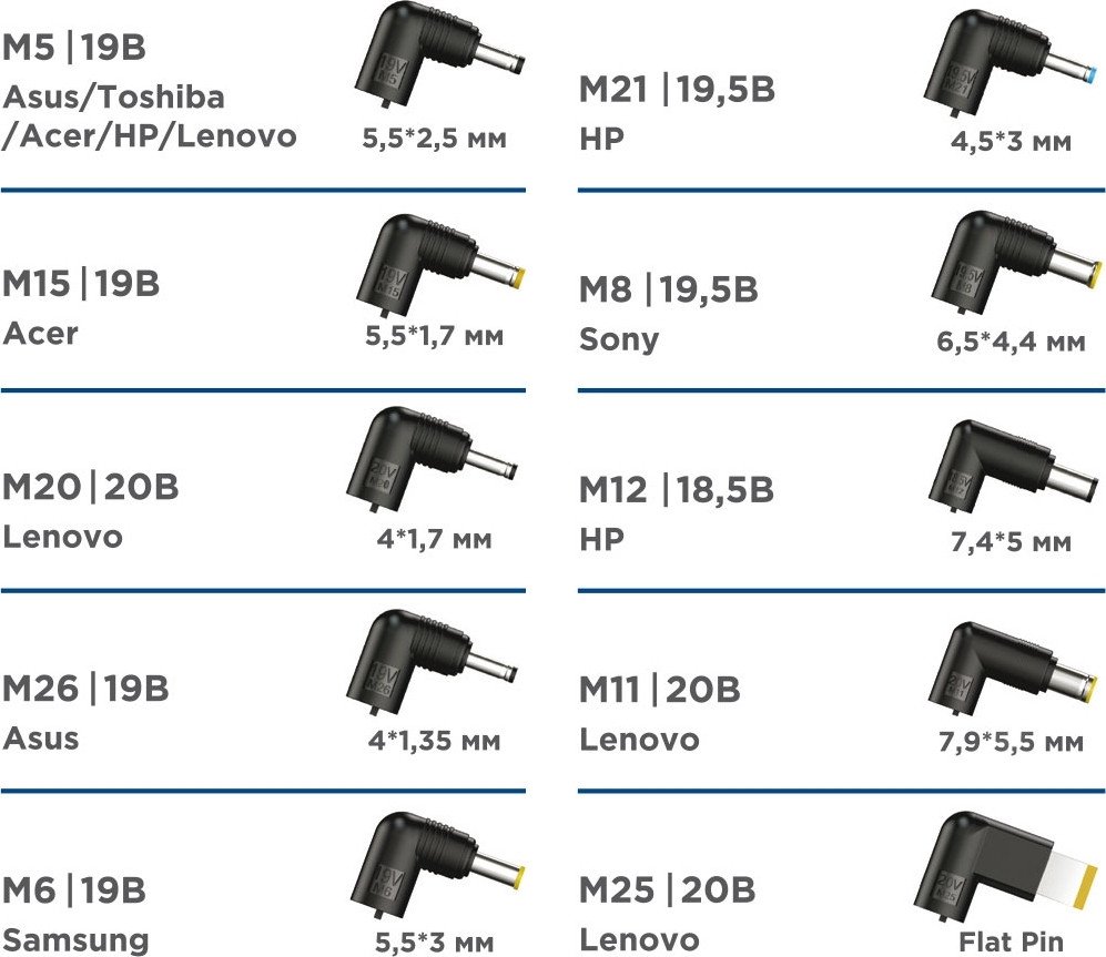 | Размер разъема питания ноутбука | 4.0 x 1.35 мм, 4.0 x 1.7 мм, 4.5 x 3.0 мм, 5.5 x 1.7 мм, 5.5 x 2.5 мм, 5.5 x 3.0 мм, 6.5 x 4.4 мм, 7.4 x 5.0 мм, 7.9 x 5.5 мм |