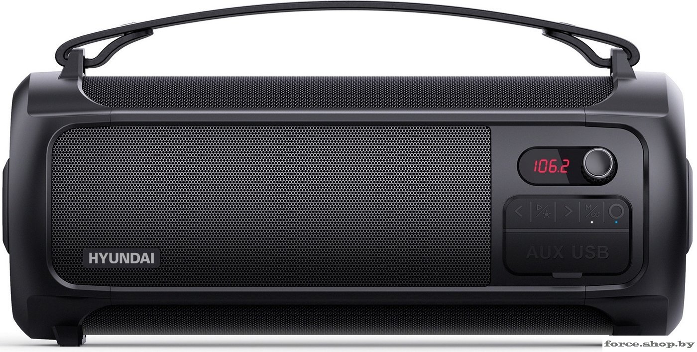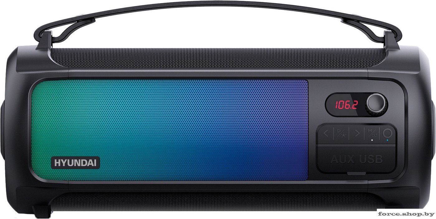 | Информация | Hyundai H-PS1025 – это эргономичная портативная колонка с удобной петлёй для переноски, стереодинамиками мощностью 40 Вт и широкой полосой воспроизводимых частот от 20 Гц до 20000 КГц.###BR######BR###Громкости, создаваемой акустикой, вполне хватит для пикника или семейного мероприятия. Соотношение сигнала и шума у данной модели также является её сильной стороной – оно составляет порядка 96 дБ.###BR######BR###Источником для Hyundai H-PS1025 может служить устройство, поддерживающее синхронизацию по современному беспроводному протоколу Bluetooth версии 5.0. Соединение будет стабильным на расстоянии до 10 м. Также к прибору можно подключиться и с помощью классического AUX-кабеля – соответствующий вход на нём имеется. Если подходящего источника под рукой нет, им может служить встроенный FM-тюнер с FM-диапазоном частот от 87.5 до 108 МГц.###BR######BR###Кроме того, колонка оснащена литий-ионным аккумулятором с ёмкостью 3000 мАч и временем полной зарядки в районе всего 3 часов. При этом время непрерывного воспроизведения у прибора достигает 10 часов. Питаться Hyundai H-PS1025 может как от встроенной батареи, так и напрямую от сети.###BR######BR###Все регуляторы и органы управления располагаются на передней панели акустики – это тач-кнопки и яркий ЖК-дисплей с поворотным регулятором для настройки радиоприёмника.###BR######BR###Приятным дополнением к функционалу портативной акустики Hyundai H-PS1025 является наличие в ней красочной и насыщенной RGB-подсветки, имитирующей ритмичную работу светомузыки. На верхней части корпуса выполнена удобная ручка, за которую можно брать колонку. |