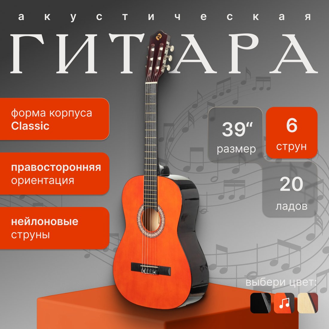 | Информация | - Акустическая гитара ROKSO FT-C-B39 - это инструмент, сочетающий классический дизайн и современные материалы, что делает его отличным выбором для музыкантов разного уровня. - Корпус гитары выполнен из легкой и прочной липы. Форма classic обеспечивает мягкое и теплое звучание, подходящее для различных жанров музыки. - Шесть нейлоновых синтетических струн обеспечивают мягкое и комфортное звучание, а гриф из катальпы в сочетании с пластиковой накладкой гарантирует долговечность и удобство при игре. На грифе расположено 20 ладов, что упрощает навигацию и расширяет возможности исполнения. - Открытые колки позволяют быстро и стабильно настраивать инструмент, а классическая конструкция без катавея делает гитару идеальной для освоения базовых техник и для регулярных занятий. |