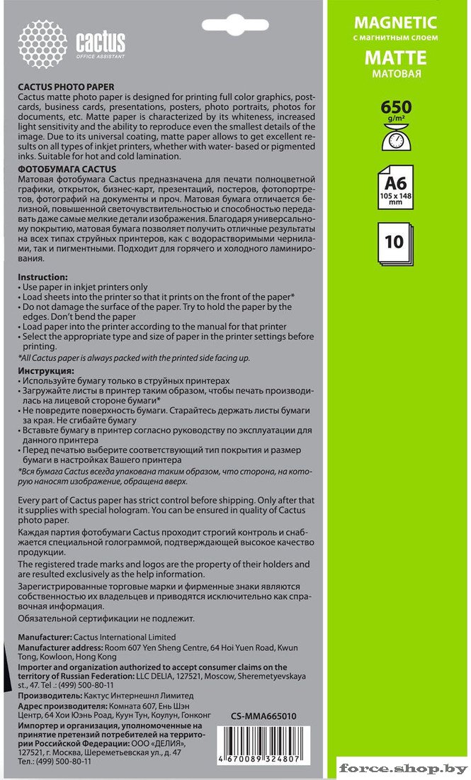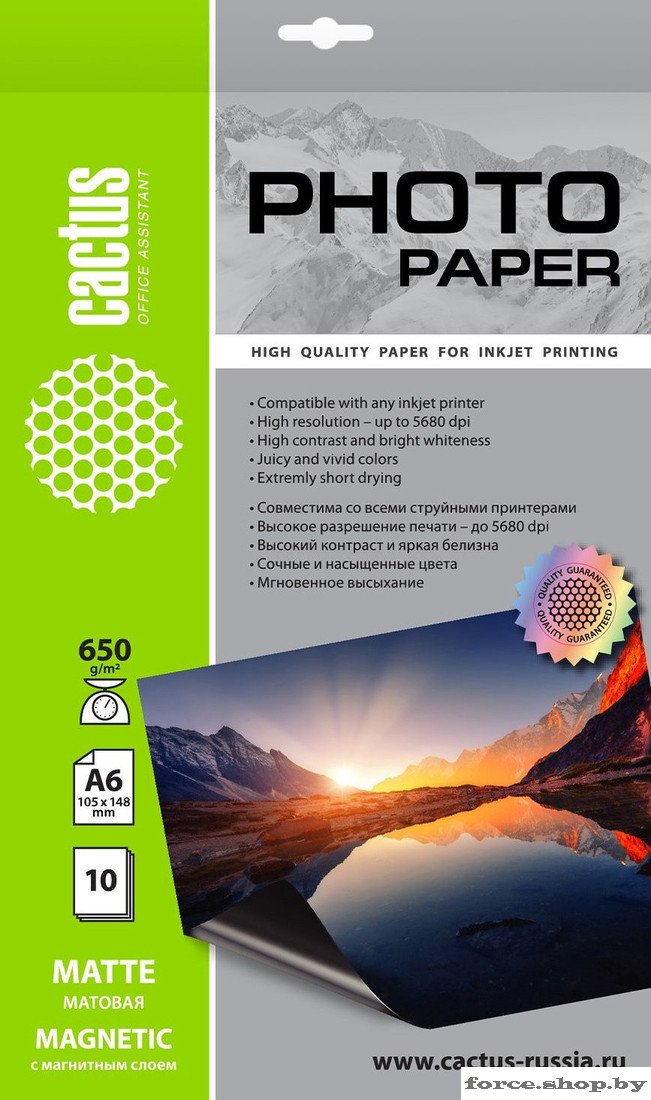 Бумага с магнитным слоем CACTUS матовая A6 650г/м2 10 л CS-MMA665010