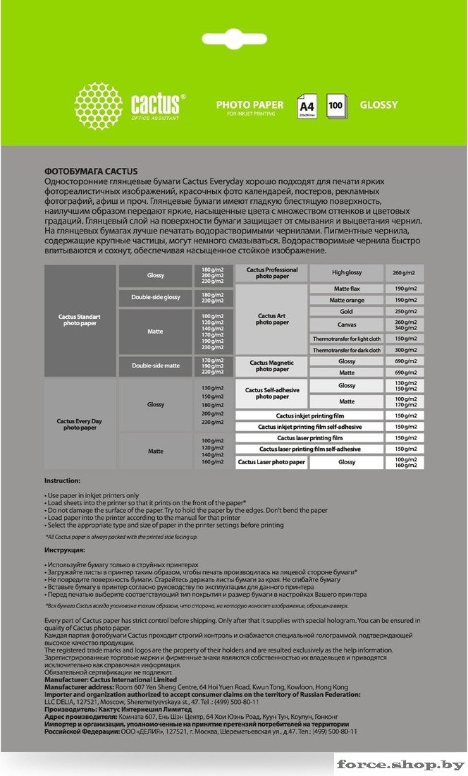 | Информация | ??Текст описания составлен при помощи искусственного интеллекта.###BR######BR###- Высококачественная глянцевая фотобумага CACTUS идеально подходит для струйной печати.###BR######BR###- Упаковка содержит 100 листов формата A4, обеспечивая достаточное количество материала для печати большого количества фотографий.###BR######BR###- Поверхностная плотность бумаги составляет 150 г/кв.м., что делает ее прочной и устойчивой к истиранию.###BR######BR###- Фотографии, напечатанные на этой бумаге, будут иметь яркие цвета и высокую контрастность благодаря глянцевой поверхности.###BR######BR###- Идеальный выбор для создания профессиональных фотографий или печати изображений высокого качества. |