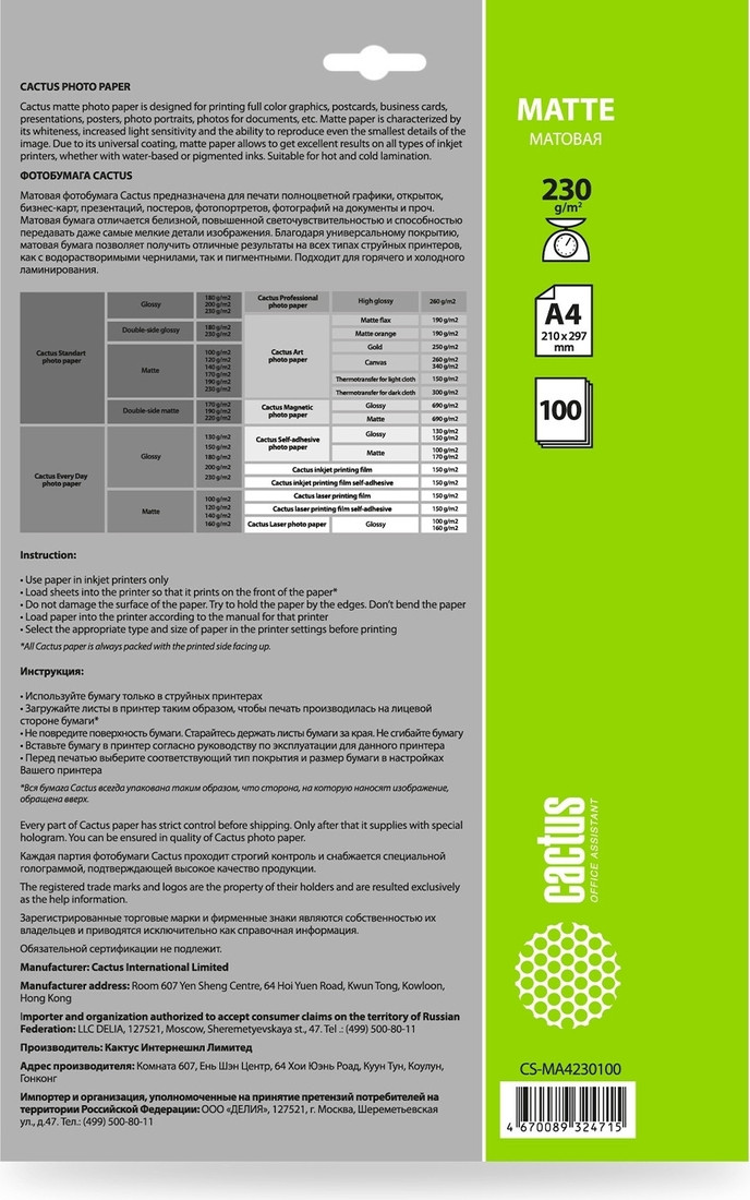 Фотобумага CACTUS Матовая A4 230 г/кв.м. 100 листов CS-MA4230100