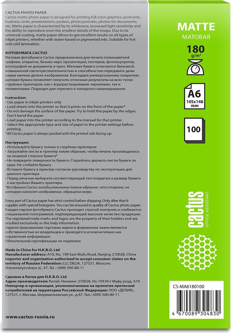 Фотобумага CACTUS Матовая A6 10x15 180 г/м2 100 листов CS-MA6180100