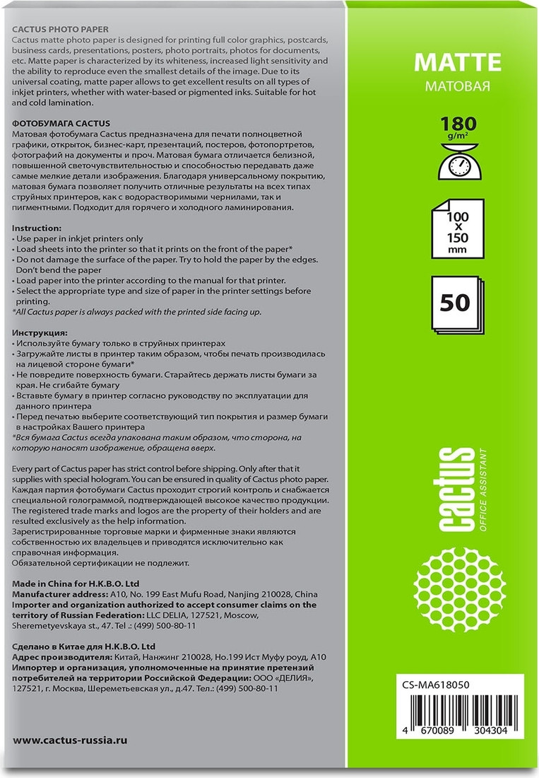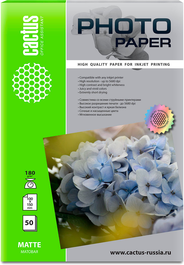Фотобумага CACTUS Матовая A6 10x15 180 г/м2 50 листов CS-MA618050