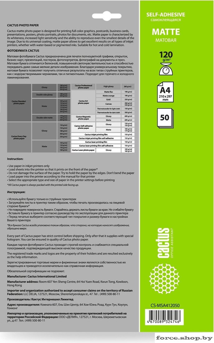 Самоклеящаяся бумага CACTUS матовая A4 120г/м2 50 л CS-MSA412050