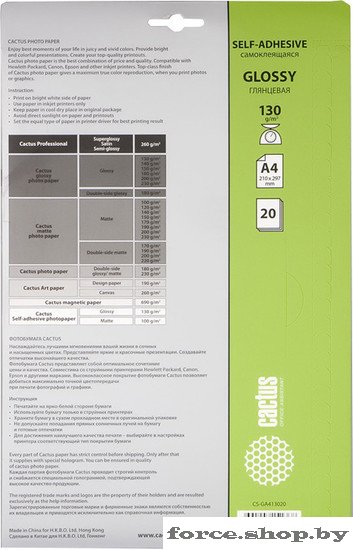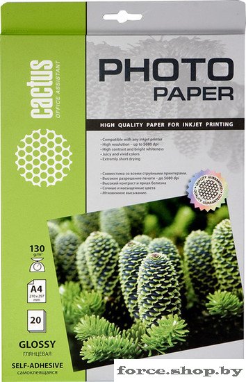 Самоклеящаяся бумага CACTUS Самоклеящаяся глянцевая A4 130 г/кв.м. 20 листов (CS-GSA413020)