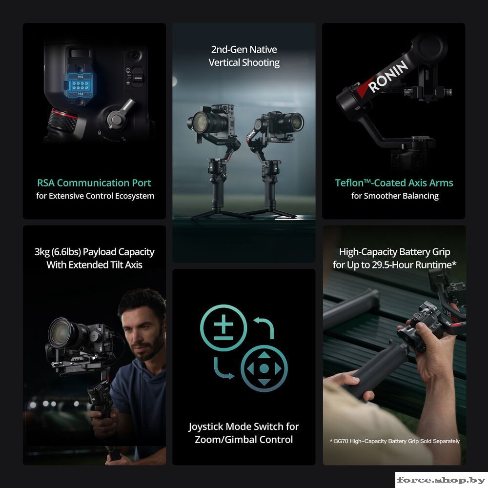 | Информация | - Новая эра вертикальной съемки###BR###DJI RS 4 оснащен обновленной горизонтальной пластиной, которая поддерживает второе поколение нативной вертикальной съемки. Быстро и просто переведите стабилизатор в вертикальный режим без дополнительных аксессуаров — достаточно разблокировать и зафиксировать пластину.###BR######BR###- Автоматические блокировки осей для удобства работы###BR###Автоматическая фиксация осей ускоряет подготовку к съемке, переход в режим сна и хранение.###BR###Минимальные зазоры в блокировках уменьшают вибрации и обеспечивают плавность стабилизации.###BR######BR###- Точная балансировка и надежность###BR###Регулировочный винт на оси наклона позволяет точно настраивать баланс при смене камеры или объектива.###BR###Верхняя быстросъемная пластина с направляющей надежно фиксирует камеру, предотвращая смещения во время съемки.###BR######BR###- OLED-экран с авто-блокировкой###BR###Экран автоматически блокируется, предотвращая случайные нажатия.###BR###В заблокированном режиме отображает текущие настройки с пониженной яркостью, экономя заряд батареи.###BR######BR###- Компактность и высокая грузоподъемность###BR###Легкий корпус и нагрузка до 3 кг позволяют использовать основные беззеркальные камеры с объективами без ущерба для комфорта.###BR###Ось наклона увеличена на 8,5 мм, что дает больше пространства для балансировки камеры с ND-фильтрами и другими аксессуарами.###BR######BR###- Оптимизированный алгоритм стабилизации###BR###Обновленный алгоритм DJI RS обеспечивает баланс между плавностью стабилизации и естественностью движений камеры.###BR###Улучшенная устойчивость в вертикальном режиме для динамичных съемок, включая бег, съемку с низкого угла и быструю панорамную съемку.###BR######BR###- Дистанционное управление камерой и объективом###BR###Технология Dual-Mode Bluetooth позволяет удаленно управлять затвором и зумом камеры.###BR###Совместимость с DJI Focus Pro Motor дает возможность точной настройки фокуса и зума с помощью джойстика или колесика управления.###BR######BR###- Гибкие режимы съемки и кастомизация###BR###FPV-режим: удерживание триггера заставляет все три оси следовать за движениями руки, что удобно для съемки POV-кадров и вращений.###BR###Переключение режимов стабилизации: PF, PTF, FPV, 3D Roll 360 или кастомный режим.###BR######BR###- Расширенные возможности подключения###BR###Порт RSA позволяет подключать DJI RS Tethered Control Handle и сторонние аксессуары.###BR###Поддержка DJI RS SDK для создания кастомных функций разработчиками. |