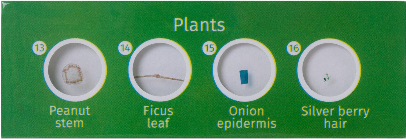 | Образцы микропрепаратов | муравей, волоски (шефердия), шерсть (мышь, заяц, собака, овца), стебель (арахис), лист (фикус), лапка (пчела, муха), брюшко (пчела), крыло (саранча), тля, яйцо (креветка), дафния, кожица (лук), пыльца (лилия, сосна, каплистемон), споры (папоротник), нити (цветные), бумага (самодельная), отпечатки пальцев, ткань (бемберг) |