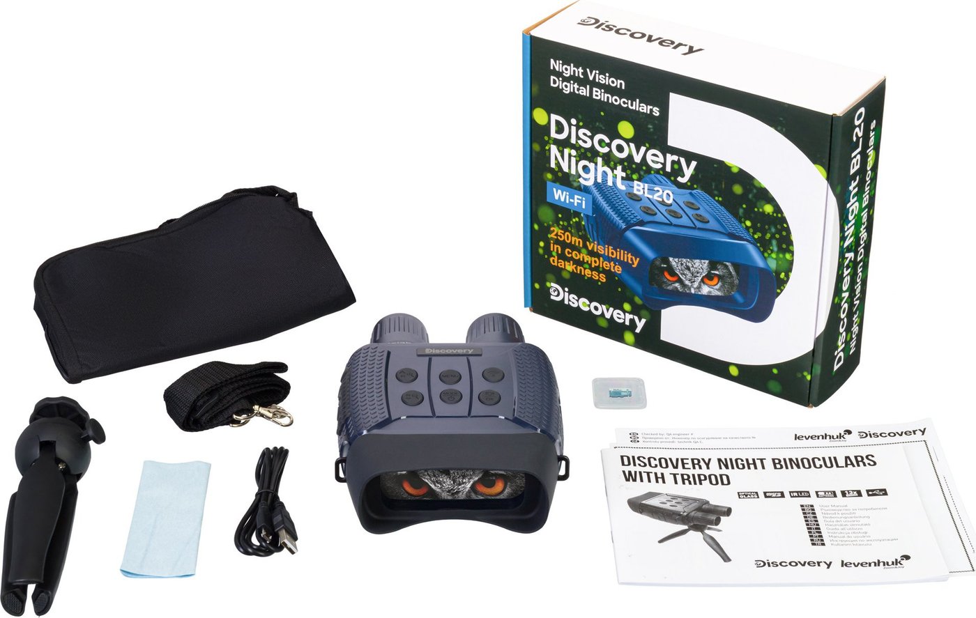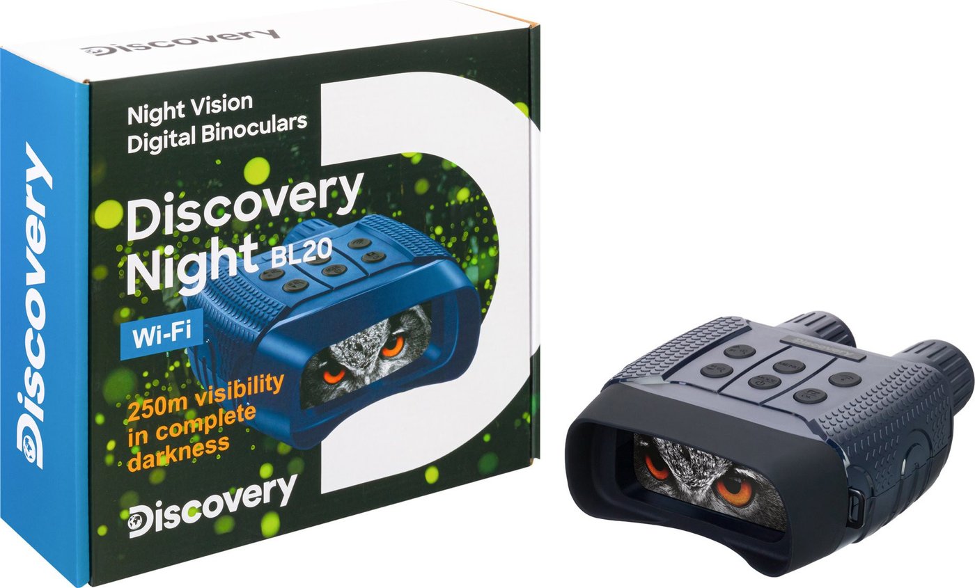 | Информация | - Discovery Channel – это знаменитый научно-популярный телеканал, который погружает зрителей в мир науки, технологий и приключений. Уникальные истории разных жанров открывают новые горизонты, позволяя взглянуть на людей, места и события, формирующие нашу реальность. Discovery вдохновляет миллионы, предлагая возможность узнать что-то новое и удовлетворить жажду познания. - Представляем серию оптики Discovery, созданную в сотрудничестве с Levenhuk. - Levenhuk Discovery Night BL20 – это бинокль ночного видения с цифровым преобразователем, который подходит как для ночных, так и для дневных наблюдений. Он не боится яркого света и отлично работает при любых условиях освещения. Днем вы получите цветное изображение, а ночью – черно-белое. Встроенный рекордер позволяет записывать фото и видео, а модуль Wi-Fi дает возможность управлять устройством с помощью смартфона или планшета. Этот прибор идеально подходит для ночной охоты, разведки и охраны территорий. - В полной темноте дальность обнаружения достигает 250 метров. Стеклянная оптика с покрытием на основе диоксида кремния обеспечивает четкие и детализированные изображения без искажений. Доступно цифровое увеличение, а в полной темноте прибор позволяет видеть на расстоянии до 250 метров. В дневное время можно фокусироваться на объектах, находящихся на расстоянии от 3 метров и более. Встроенная ИК-подсветка с 7 уровнями яркости помогает различать мелкие детали, не расходуя заряд батареи слишком быстро. - Встроенный рекордер позволяет делать фото и записывать видео, фиксируя самые интересные моменты наблюдений. Разрешение для фото составляет 2048x1536 пикселей, для видео – 1280x960 пикселей с частотой 30 кадров в секунду. Изображения получаются четкими, а видео – плавными. Запись ведется на карту памяти, а отснятый материал можно просмотреть на экране прибора или перенести на компьютер через USB. - Прибор спроектирован для удобства полевых наблюдений. Эргономичный корпус защищен от влаги, а кнопки расположены так, что их легко найти даже в темноте. Питание осуществляется от стандартных батареек, что упрощает замену в длительных походах. На одном заряде прибор работает от 4 до 10 часов, в зависимости от использования подсветки. В комплект входит небольшой штатив, который позволяет установить бинокль на землю или на ствол дерева для стабильного изображения. - Модуль Wi-Fi позволяет управлять прибором с помощью смартфона или планшета на iOS или Android. Связь возможна на расстоянии до 15 метров, требуется установка мобильного приложения, доступного в App Store и Google Play. Удаленно можно регулировать настройки, просматривать фото и видео, а также управлять файлами. - Обратите внимание: ИК-подсветка может быть заметна для фото- и видеокамер. - Основные особенности: • Цифровой преобразователь – не боится яркого света • Цветное изображение днем, черно-белое ночью • Цифровое увеличение и оптика с просветлением • Невидимая ИК-подсветка с 7 уровнями яркости • Рекордер для высококачественной записи фото и видео • Питание от стандартных батареек, до 10 часов работы на одном заряде • Эргономичный корпус с влагозащитой класса IP54 • Модуль Wi-Fi для удаленного управления через мобильное приложение - Комплектация: • Прибор ночного видения • Кабель miniUSB 2.0 • Карта памяти microSD 32 ГБ • Ремешок • Чехол • Настольный штатив • Инструкция по эксплуат