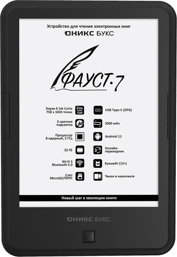 | Информация | - ОНИКС БУКС Фауст 7 — устройство для чтения электронных книг с экраном 6 дюймов и отличным сочетанием цены и характеристик. Модель оборудована дисплеем E Ink Carta (Carta 1200) с подсветкой и сенсорным управлением и выполнена в классическом корпусе с удобными кнопками управления. - Современный 8-ядерный процессор обеспечивает высокую скорость работы ридера, а 32 ГБ твердотельной памяти в сочетании со слотом micro SD позволяют хранить большое количество книг и документов непосредственно на устройстве. Модель имеет двухдиапазонный модуль Wi-Fi, позволяющий использовать различные сетевые сервисы. - Поддержка Bluetooth дает возможность подключать беспроводные устройства, такие как наушники или колонки. Благодаря операционной системе Android 11 можно устанавливать на ридер различные сторонние программы. В составе ПО имеется магазин приложений RuStore, с помощью которого можно безопасно скачивать, покупать и обновлять приложения. - Аудиоплеер позволяет прослушивать аудиокниги и музыку, а функция TTS - озвучивать текстовые файлы. В комплекте с ридером поставляется удобная защитная обложка. На ридере предустановлено множество полезных приложений, включая онлайн библиотеку Яндекс Книги (12+). |