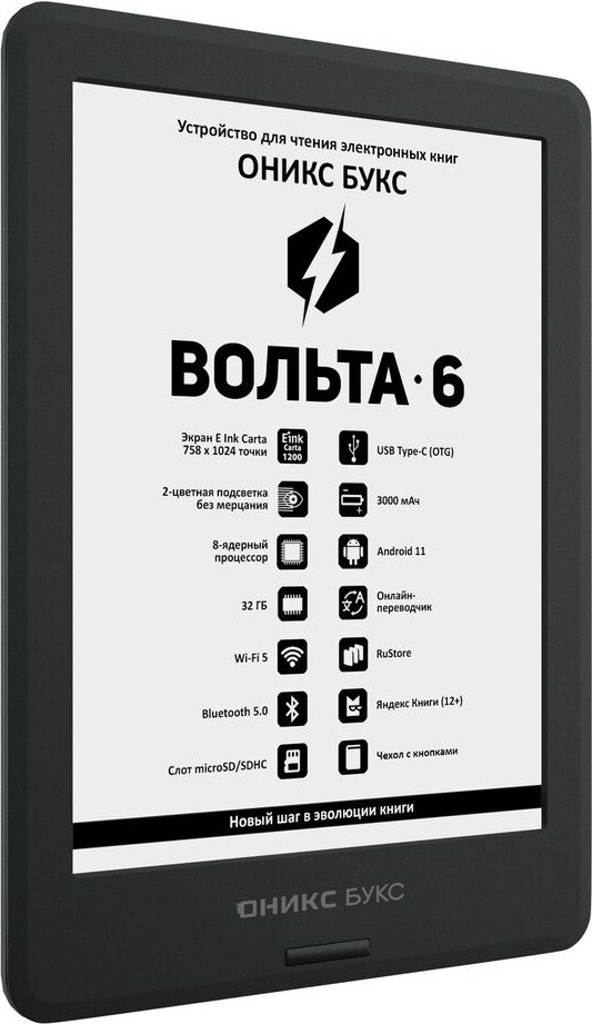 | Информация | - ОНИКС БУКС Вольта 6 — компактное устройство для чтения электронных книг, оборудованное 6-дюймовым экраном E Ink Carta (Carta 1200) с подсветкой и сенсорным управлением. Современный 8-ядерный процессор обеспечивает высокую скорость работы ридера, а 32 ГБ твердотельной памяти в сочетании со слотом microSD позволяют хранить большое количество книг и документов непосредственно на устройстве. Модель оборудована двухдиапазонным модулем Wi-Fi, позволяющим выходить в Интернет и использовать различные сетевые сервисы. Поддержка Bluetooth дает возможность подключать беспроводные устройства, включая наушники и колонки. Благодаря операционной системе Android 11 можно устанавливать на ридер различные сторонние программы. На ридере предустановлен магазин приложений RuStore, с помощью которого можно безопасно скачивать, покупать и обновлять приложения. Аудиоплеер позволяет прослушивать аудиокниги и музыку, а функция TTS - озвучивать текстовые файлы. На ридере предустановлено множество полезных приложений, включая онлайн библиотеку Яндекс Книги (12+). В комплекте с Вольта 6 поставляется защитная обложка с удобными кнопками управления на боковой панели. - Подсветка экрана Технология MOON Light 2 позволяет пользоваться устройством в темноте или условиях плохого освещения, без вреда для зрения. При использовании данной функции создаётся мягкое свечение экрана, оптимальное для тёмных помещений. Подсветка имеет регулировку цветовой температуры, а благодаря применению технологии Flicker-Free у нее полностью отсутствует мерцание. - Сенсорное управление Ёмкостный сенсорный экран с функцией Multi-touch обеспечивает удобство при чтении или настройках: листание, масштабирование, вызов контекстного меню и многое другое. Управлять ридером также удобно, как смартфоном или планшетом. - Высокая производительность Современный 8-ядерный процессор с тактовой частотой 2 ГГц в сочетании с 2 ГБ оперативной памяти обеспечивают комфортную работу с любыми сложными документами. 32 ГБ энергонезависимой памяти и слот с поддержкой карт памяти microSD дают возможность хранить на устройстве огромную библиотеку нужных книг. - Поддержка форматов Программное обеспечение ОНИКС БУКС позволяет открывать файлы множества различных текстовых и графических форматов. При чтении вы можете менять стиль и размер шрифта, расположение страниц, а также ставить закладки и произвольно масштабировать документы. - Встроенные словари На ридере предустановлены англо-русский и русско-английский словари, благодаря которым можно переводить иностранные слова непосредственно во время чтения. По желанию можно установить и другие словари в формате Stardict. - Удобная библиотека Библиотека сортирует книги по авторам, названиям и сериям. Удобный поиск и фильтры позволят быстро найти нужную книгу по жанру, языку, дате публикации и т.д. Кроме того, поддерживаются стандартные папки, созданные на настольном компьютере. - Простая запись контента Помимо стандартного способа записи файлов на ридер с помощью USB-кабеля, можно передавать их по Wi-Fi и Bluetooth или с использованием QR-кода. Также доступен облачный PUSH-сервис. - «Умная» обложка В комплекте с книгой поставляется «умная» обложка, обеспечивающая надёжную защиту экрана и автоматически переводящая устройство в спящий режим при закрытии. - Bluetooth-модуль Благодаря встроенном