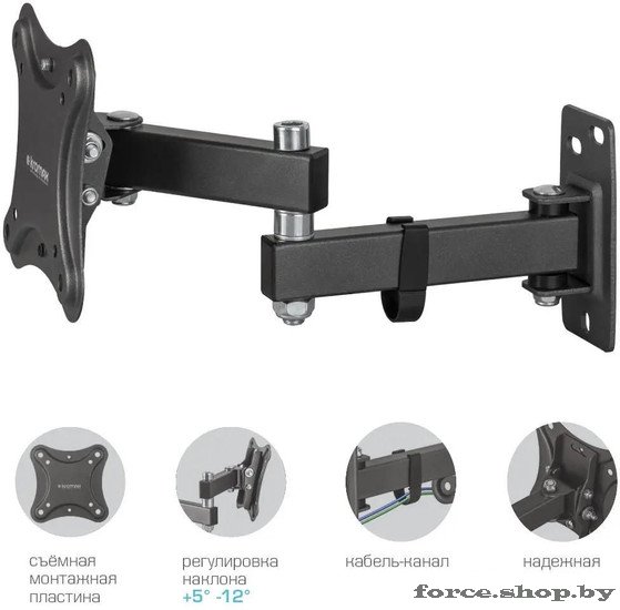| Информация | ? Кронштейн KROMAX CORBEL-3 BLACK надежно удерживает экран размером 10"-34" дюйма и весом до 25 кг. Простая конструкция идеально подходит для самостоятельного монтажа.###BR######BR###? Наклонно-поворотная регулировка позволяет наклонять экран вверх и вниз на +5°-12°, поворачивать влево и вправо на ±90°, и выдвигать на 61-297 мм.###BR######BR###? Подходит для большинства телевизоров популярных брендов, таких как Samsung, LG, Sony, Panasonic, Sharp, Toshiba, KIVI, Xiaomi Mi, SUPRA, Hyundai, Erisson, и других.###BR######BR###? Крепежные отверстия изготовлены по стандарту VESA.###BR######BR###?? В комплект входят необходимые для монтажа материалы. Предоставляются гарантийные обязательства. Пожизненная гарантия на все сварные и механические соединения. Износостойкий и надежный в эксплуатации. |