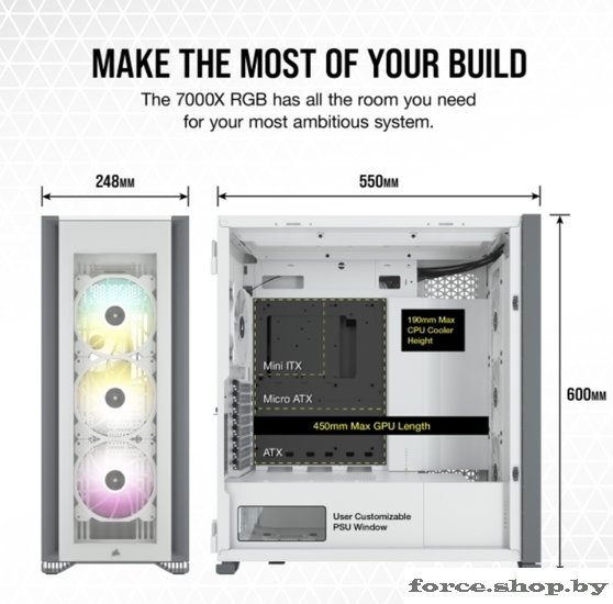 | Информация | За тремя изготовленными из закаленного стекла панелями корпуса CORSAIR iCUE 7000X RGB формата Full-Tower ATX все компоненты вашей системы будут видны как на ладони: пространство для одновременной установки до трех 360-миллиметровых радиаторов, система скрытой прокладки кабелей и четыре входящих в комплект вентилятора CORSAIR SP140 RGB ELITE.###BR######BR###Программное обеспечение CORSAIR iCUE объединяет все настройки, превращая вашу игровую станцию в цельную экосистему с эффектом полного погружения и интуитивно понятным управлением.###BR######BR###Корпус iCUE 7000X RGB в сочетании с программным обеспечением CORSAIR iCUE является лучшим в своем классе интеллектуальным корпусом. Программное обеспечение iCUE позволяет легко настраивать RGB-подсветку и управлять скоростью вращения до шести вентиляторов.###BR######BR###COMMANDER CORE XT — это больше, чем просто контроллер для управления подсветкой и скоростью вращения до шести вентиляторов. Его функционал можно расширить для мониторинга температуры (два температурных датчика входят в комплект поставки). Кроме того, контроллер COMMANDER CORE XT можно подключить к другим совместимым с iCUE устройствам, таким как полосы подсветки LS100 или комплекты расширения светодиодной RGB-подсветки Lighting PRO.###BR######BR###Три прочные панели из закаленного стекла толщиной 4 мм обеспечивают обзор всех компонентов вашей системы.###BR######BR###Акцентируйте внимание на своей графической карте с помощью инновационного вертикального крепления для графических карт, которое отличается оптимальным размером для установки самых мощных современных графических карт и обеспечивает достаточное пространство для беспрепятственного воздухообмена.###BR######BR###Оснащенный окошком кожух блока питания с возможностью персонализации позволяет увидеть все компоненты системы изнутри. Снимите панель, добавьте виниловую графику, нанесите свой логотип лазером или установите подсветку, чтобы придать вашей системе индивидуальности.###BR######BR###Быстро и легко уложите основные кабели в один просторный потайной канал глубиной 25 мм за материнской платой, предусмотренный для всех кабелей, которые легко скрыть за откидной стальной дверцей. |