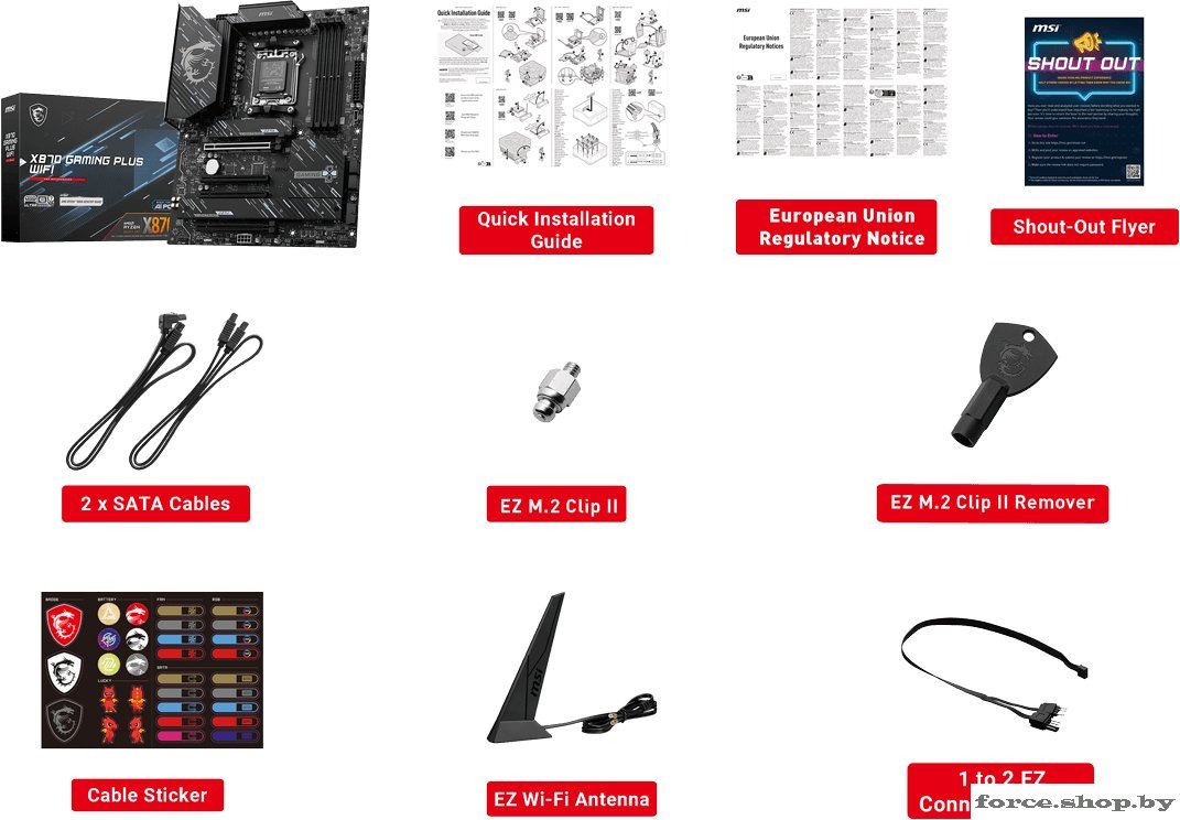 | Комплектация | - 2 кабеля SATA###BR###- EZ Wi-Fi антенна ###BR###- 1-2 EZ кабель ###BR###- винт EZ M.2 Clip II###BR###- EZ M.2 Clip II экстрактор###BR###- набор стикеров###BR###- документация |