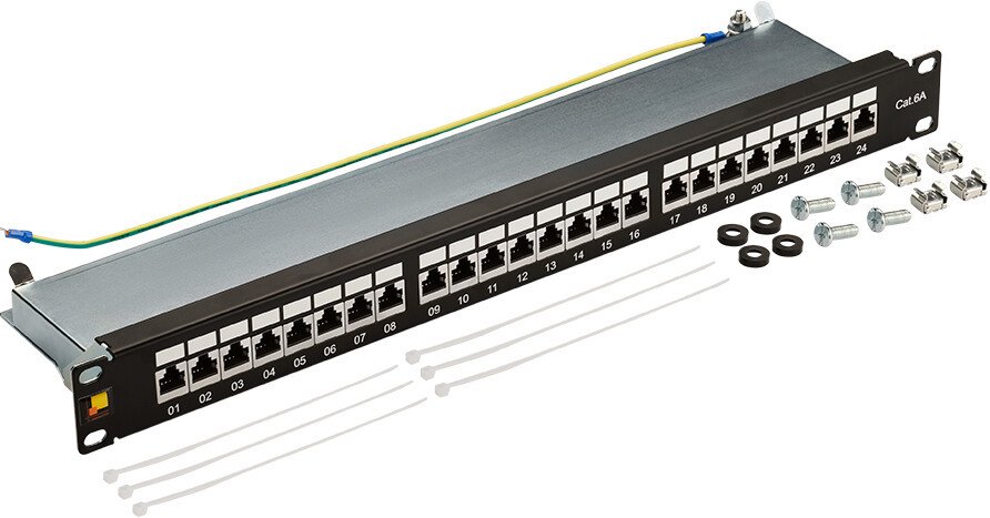 | Информация | 24-х портовая экранированная патч-панель предназначена для разделки на ней кабелей различных подсистем СКС и подключения отдельных составляющих сети друг к другу коммутационными шнурами. Соответствует требованиям категории 6А. В комплект поставки входят: Патч-панель - 1 шт. Крепежные винты - 4 шт. Стяжки для кабеля - 8 шт. Панель может монтироваться в 19-дюймовую стойку, шкаф или настенную раму, а также на стену (с помощью дополнительных кронштейнов). Для подключения абонентских кабелей используется метод врезного контакта сквозь изоляцию - IDC (Isolation Displacement Contact). DC разъемы панели являются универсальными и допускают монтаж кабеля с использованием как инструментов для 110-х контактов, так и инструментов для контактов типа Krone. На передней стороне панели смонтированы стандартные порты типа RJ-45. Конструкция панели предусматривает попарную фиксацию кабельных экранов под специальные скобы. На корпусе панели имеется заземляющий контакт. К нему подключен проводник для заземления, обжатый кольцевыми клеммами и длиной 50 см. Панель имеет встроенный органайзер для фиксации подходящих с обратной стороны кабелей. С лицевой стороны порты панели имеют цифровую нумерацию и площадки для дополнительной маркировки. Габаритные размеры (ГхШхВ) - 97мм х19"х1U |