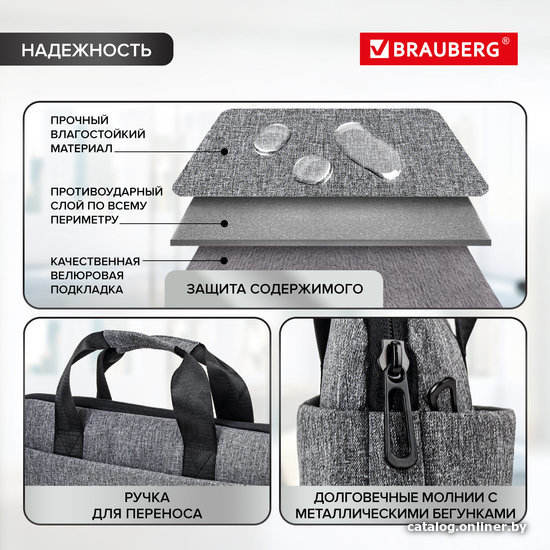 | Информация | Стильный, лаконичный, легкий и функциональный аксессуар для активной и эффективной работы, отличное решение для переноски ноутбука, планшета, документов формата А4, презентаций и других необходимых вещей. Качественные материалы надежно защитят содержимое. Деловая сумка для ноутбука с диагональю экрана до 15,6" может использоваться как ежедневно, так и для поездок в командировки или путешествия. Стенки и дно уплотнены слоем специальной амортизирующей пены, что позволяет защитить ноутбук или документы от механических повреждений. Необходимые для электронного устройства аксессуары, такие как блок питания, мышка и прочее, можно разместить отдельно, во внешних карманах, что предохранит ноутбук от царапин. Передний карман облегчит доступ к самым необходимым вещам, таким как портмоне, пишущие принадлежности, документы, телефон и прочее. Благородный серый цвет прекрасно сочетается с разными стилями в одежде. Деловая сумка изготовлена из современного, износостойкого и качественного материала — полиэстера, обладающего водоотталкивающими свойствами. Полиэстер обладает отличной устойчивостью цвета к солнечным лучам и легкостью в уходе. Загрязнения легко удаляются с помощью мыла и мягкой влажной губки. Подкладка выполнена из мягкого, приятного на ощупь велюрового материала. Сумка поставляется без плечевого ремня! Багажная лента позволяет зафиксировать рюкзак на телескопической ручке чемодана для удобного перемещения нескольких предметов багажа. Удобные прочные ручки для комфортной переноски. Сумку легко открывать и закрывать одной рукой с любой стороны — основное отделение имеет долговечную реверсивную молнию с удобными металлическими бегунками. |