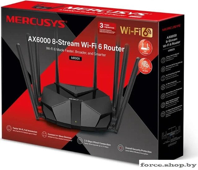 | Информация | Wi-Fi 6 — до 1148 Мбит/с на диапазоне 2,4 ГГц, до 4804 Мбит/с на диапазоне 5 ГГц.###BR###Порт 2,5 Гбит/с — позволит преодолеть гигабитный барьер и обеспечит максимальную производительность для подключённых устройств.###BR###Много одновременных подключений — технологии MU-MIMO 4?4 и OFDMA позволят разгрузить сеть и увеличить среднюю пропускную способность в четыре раза.###BR###Большая площадь покрытия — восемь всенаправленных антенн с высоким коэффициентом усиления и технологией Beamforming обеспечат стабильный Wi-Fi во всём доме.###BR###Надёжная защита — благодаря последнему стандарту шифрования WPA3.###BR###Гигабитная скорость по кабелю — передавайте данные при проводном подключении на умопомрачительной скорости.###BR###Энергосбережение — технология Target Wake Time (TWT) снижает энергопотребление мобильных гаджетов и устройств интернета вещей при передаче данных.###BR###Меньше Wi-Fi помех — технология BSS Coloring позволит свести к минимуму помехи от других сигналов.###BR###Smart Connect — с помощью умных алгоритмов подбирает наиболее подходящий диапазон для каждого устройства.###BR###Приложение MERCUSYS — обеспечит быструю настройку и простое управление Wi-Fi сетью. |